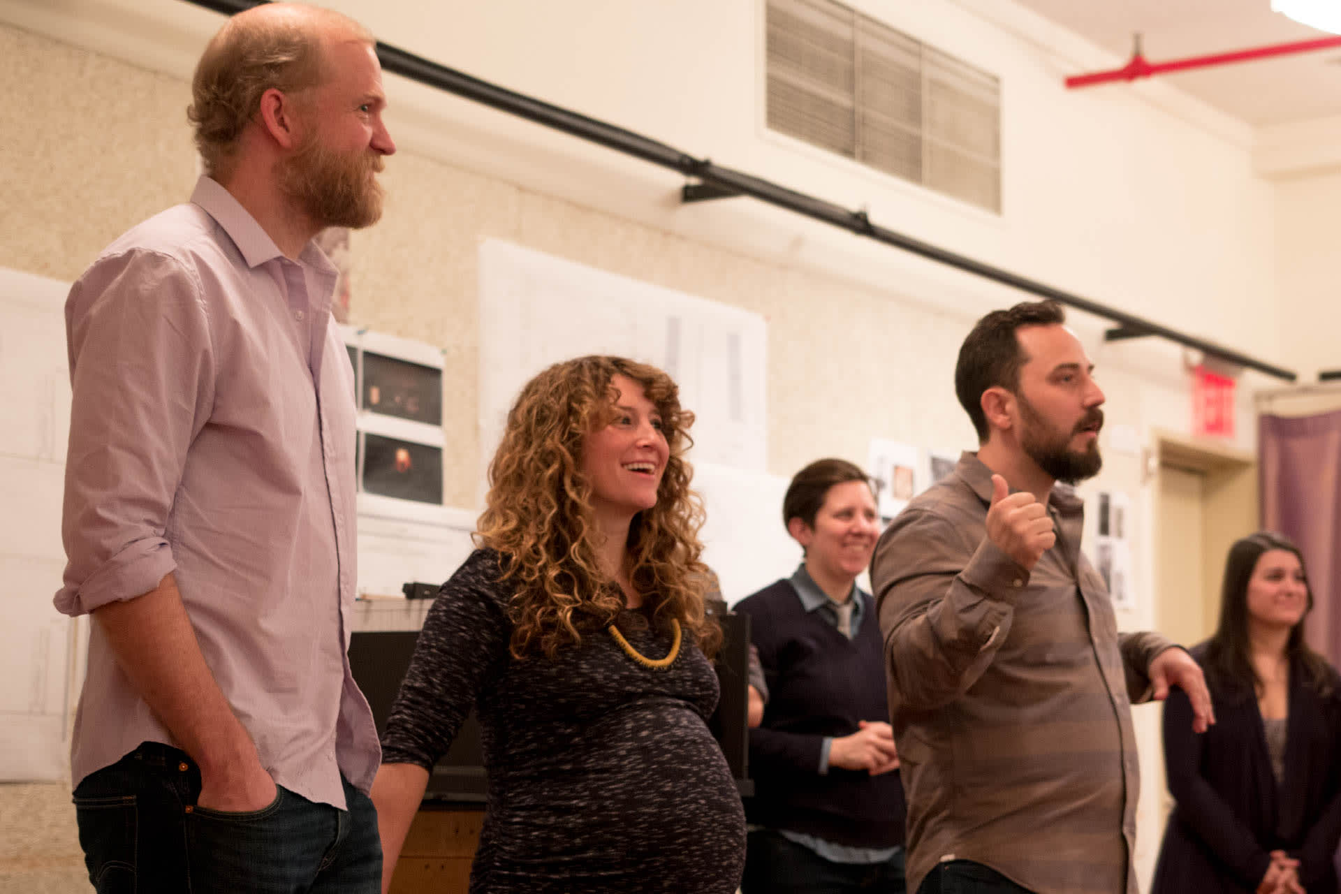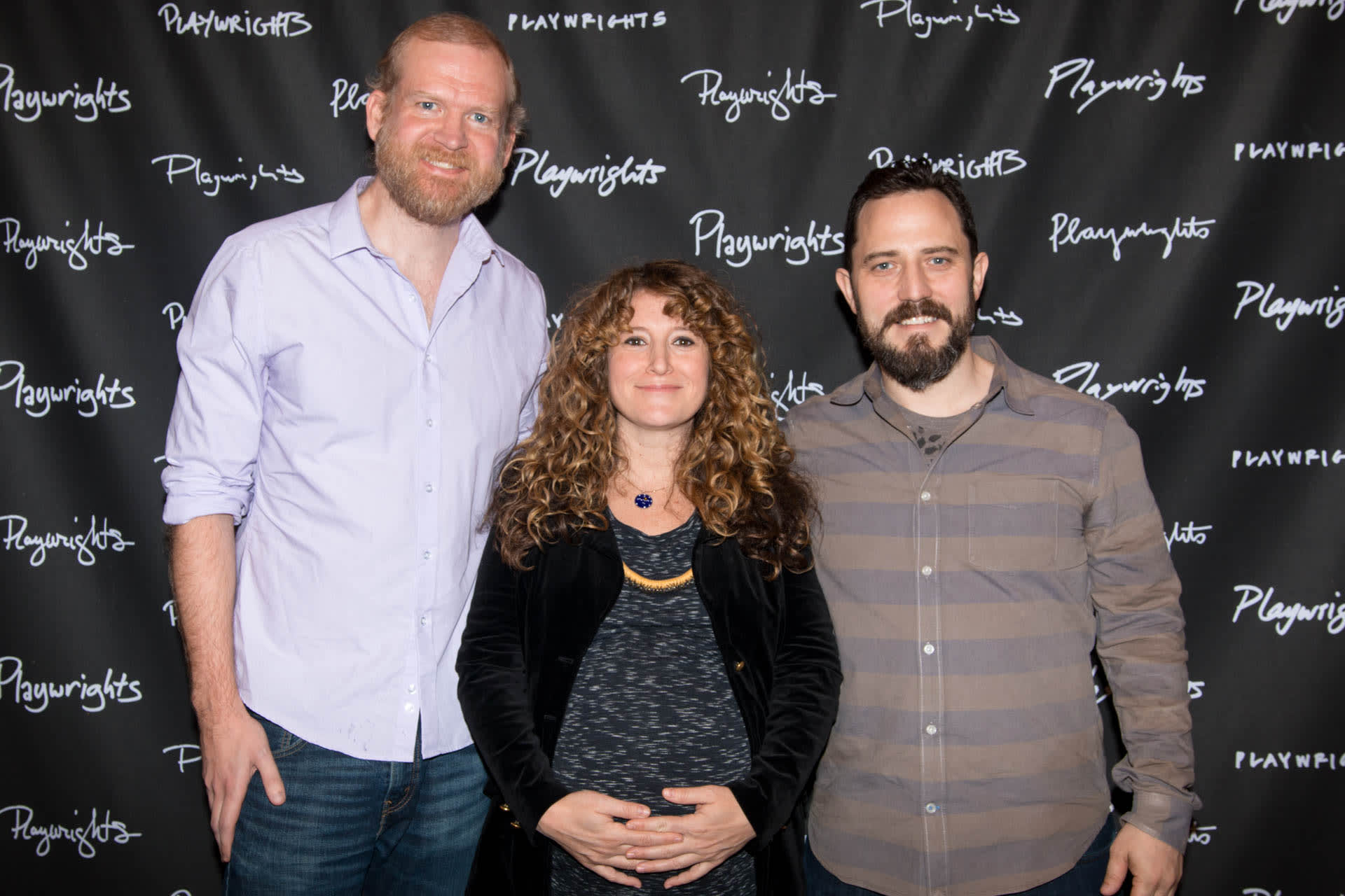 The Debate Society (Paul Thureen, Hannah Bos, Oliver Butler) with Playwrights Artistic Director Tim Sanford