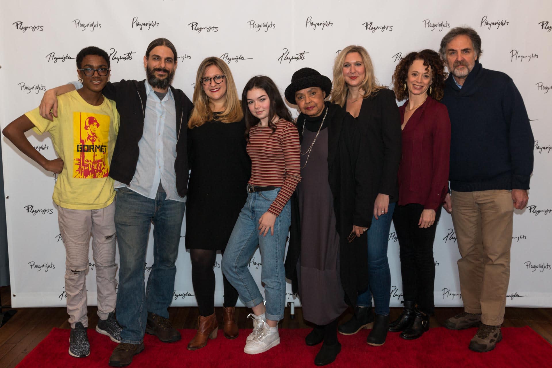 Cast members Ian Saint-Germain, Lucas Papaelias, playwright Lindsey Ferrentino, Ella Kennedy Davis, Lynda Gravatt, Cassie Beck, director Rebecca Taichman, and Playwrights Artistic Director Tim Sanford