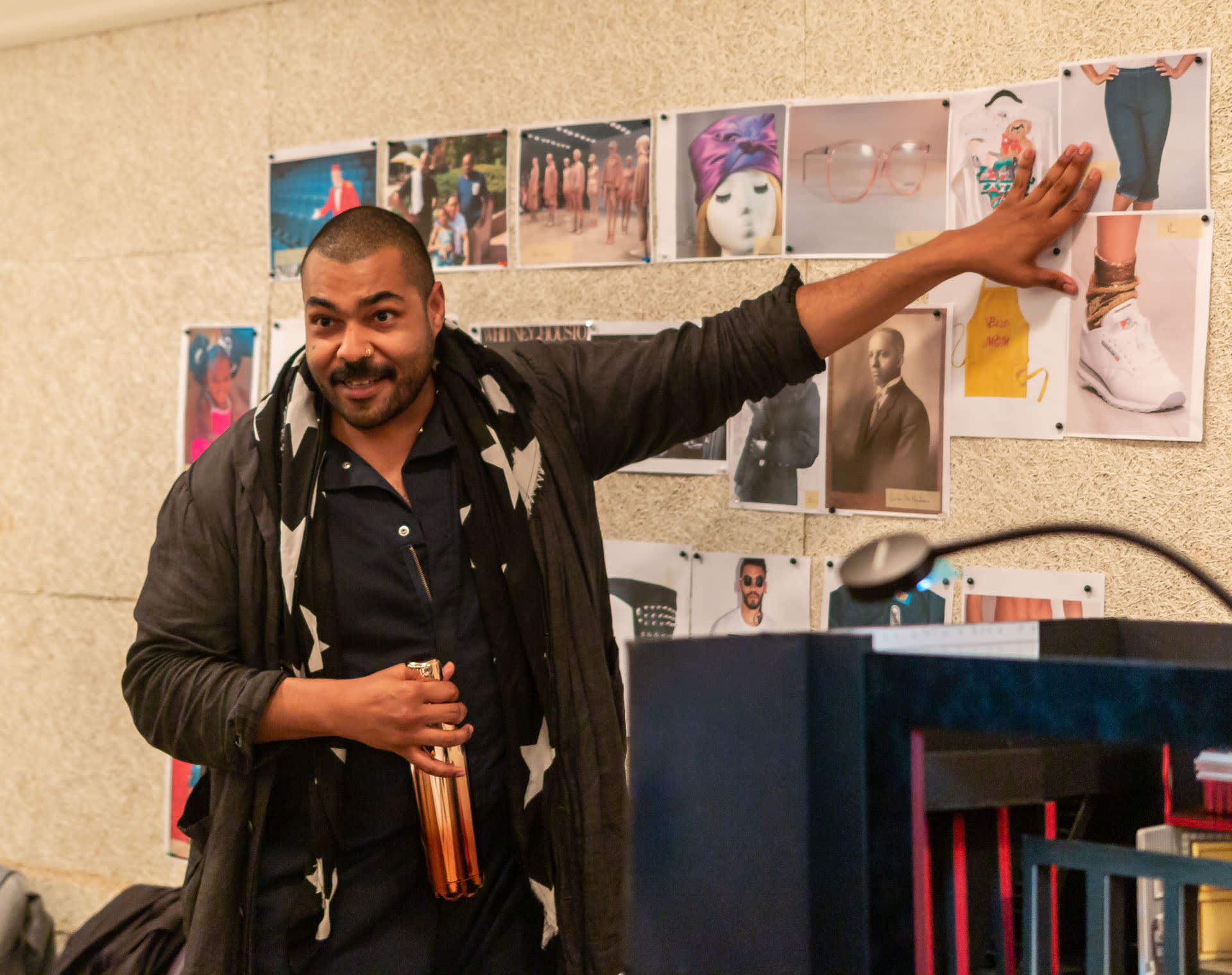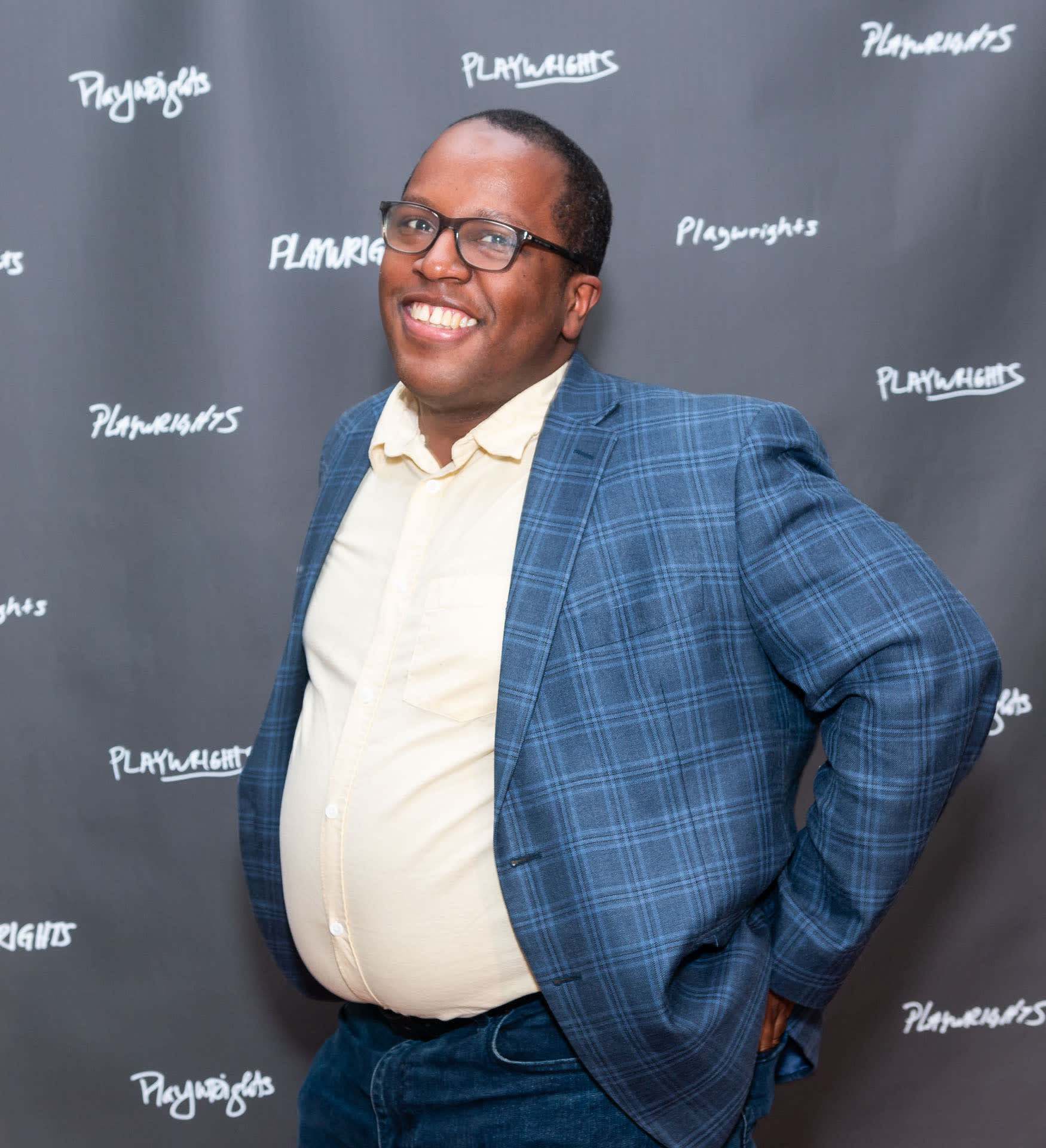 Librettist, Composer, and Lyricist Michael R. Jackson poses in front of the step and repeat.