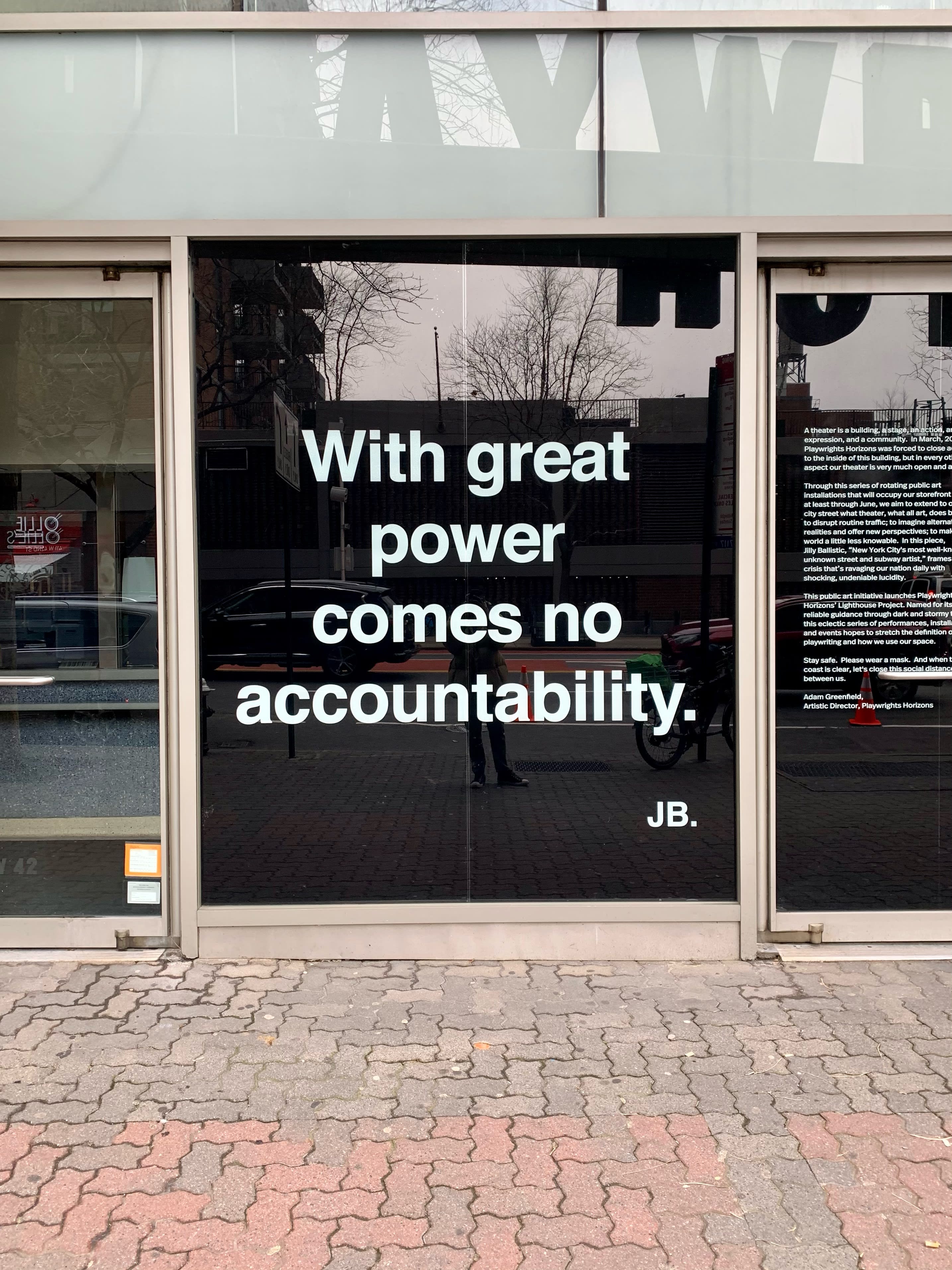 We kick off the Public Art Series with "With Great Power Comes No Accountability" by Jilly Ballistic, a street artist whose work is distinctly New York — specific to the city, to its subway walls, its rush hours, its advertisements, and MTA agents. Some of their spray-glued interventions only stay up for minutes, while others last for weeks. As tangible as the trash cans and billboards they adorn, but as ephemeral as live performance, their creations are a form of public theater played for an audience of passersby. With their upcoming piece on view at 42nd Street, Playwrights Horizons understands drama anew, not as the traffic of a stage but as the ebbs and flows of foot traffic on sidewalks and subway platforms.