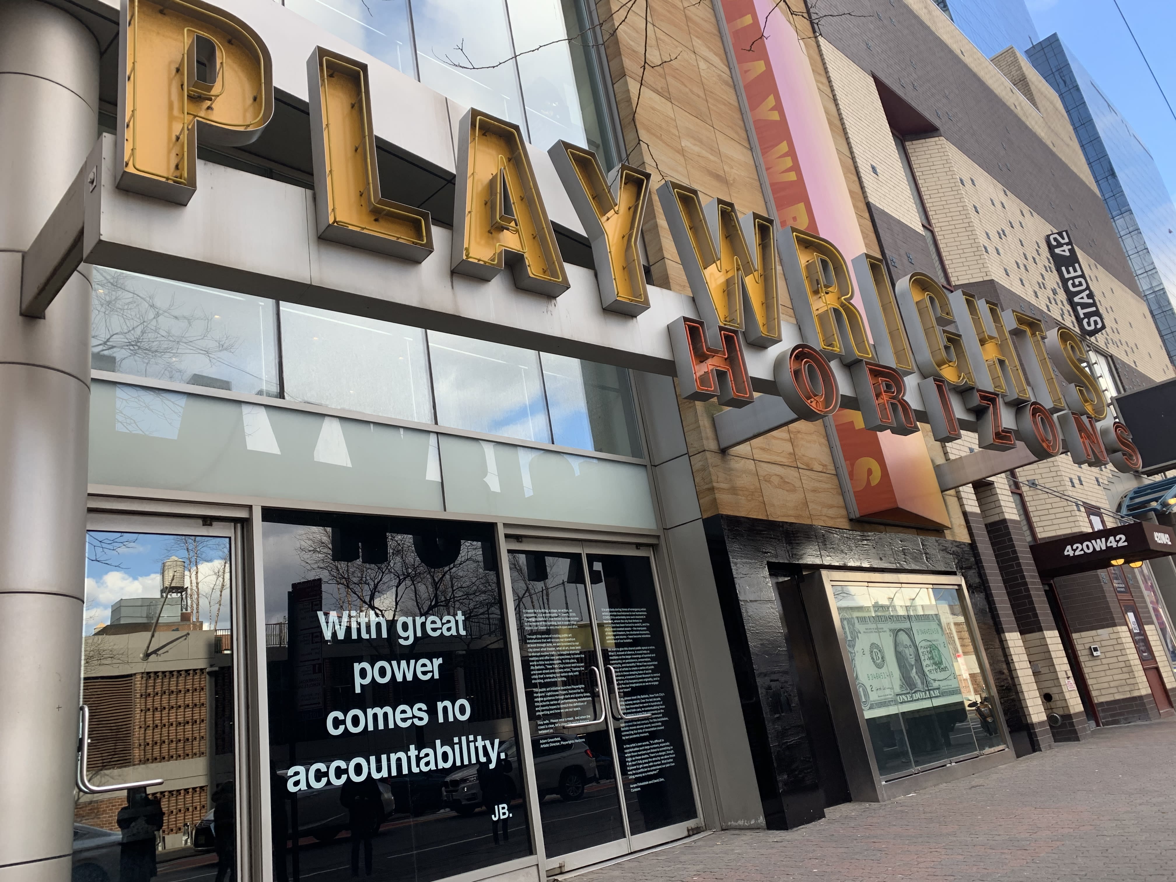 Artist Jilly Ballistic's installation outside Playwrights Horizons on 42 Street.