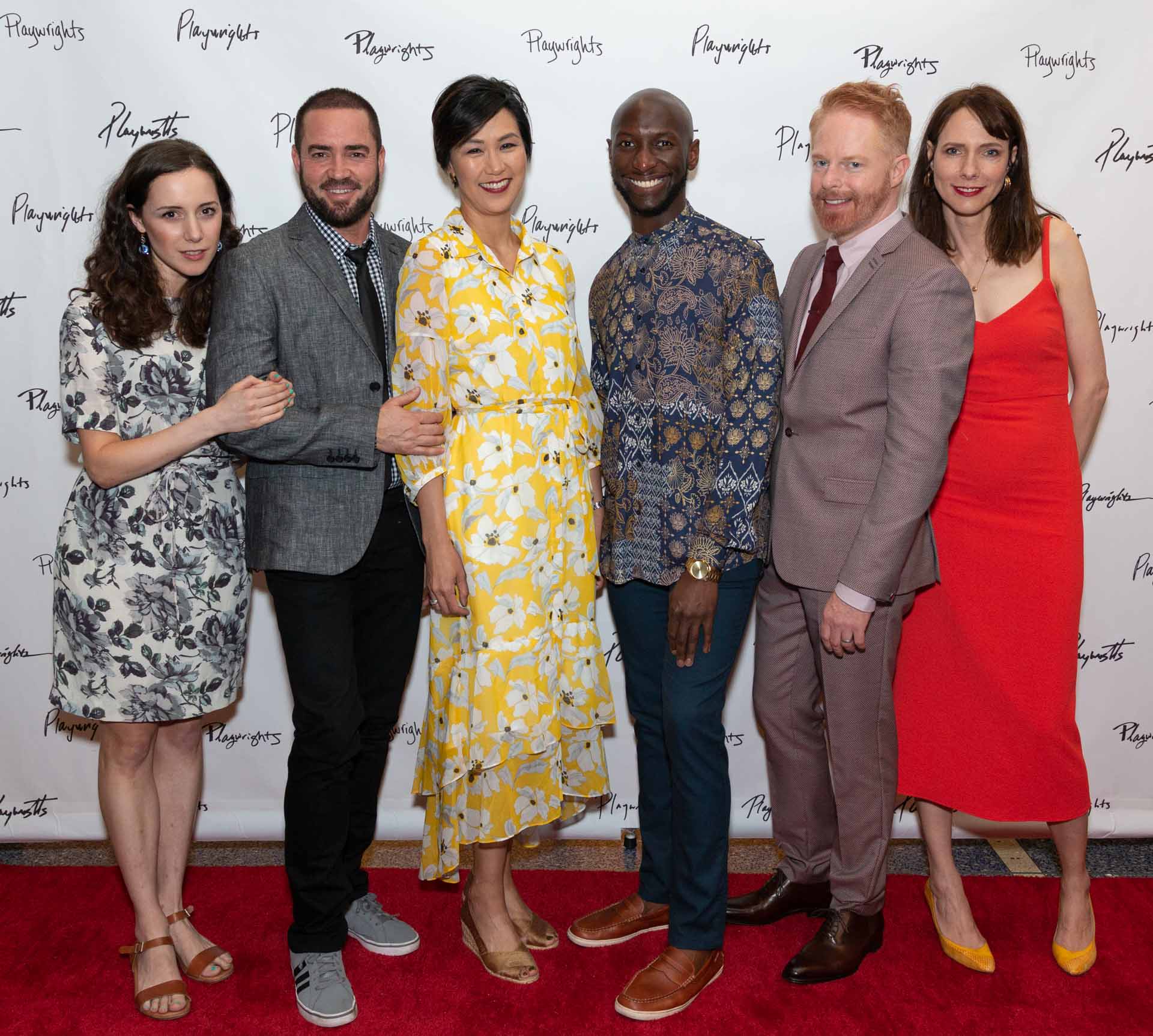 The cast of Log Cabin: Talene Monahan, Ian Harvie, Cindy Cheung, Phillip James Brannon, Jesse Tyler Ferguson, Dolly Wells.